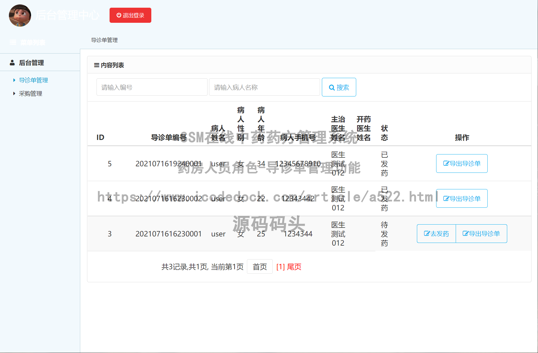 #### SSM在线中药药方管理系统-药房人员角色-导诊单管理↓↓