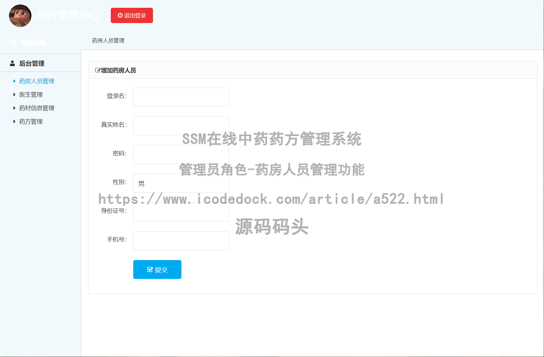 #### SSM在线中药药方管理系统-管理员角色-药房人员管理↓↓