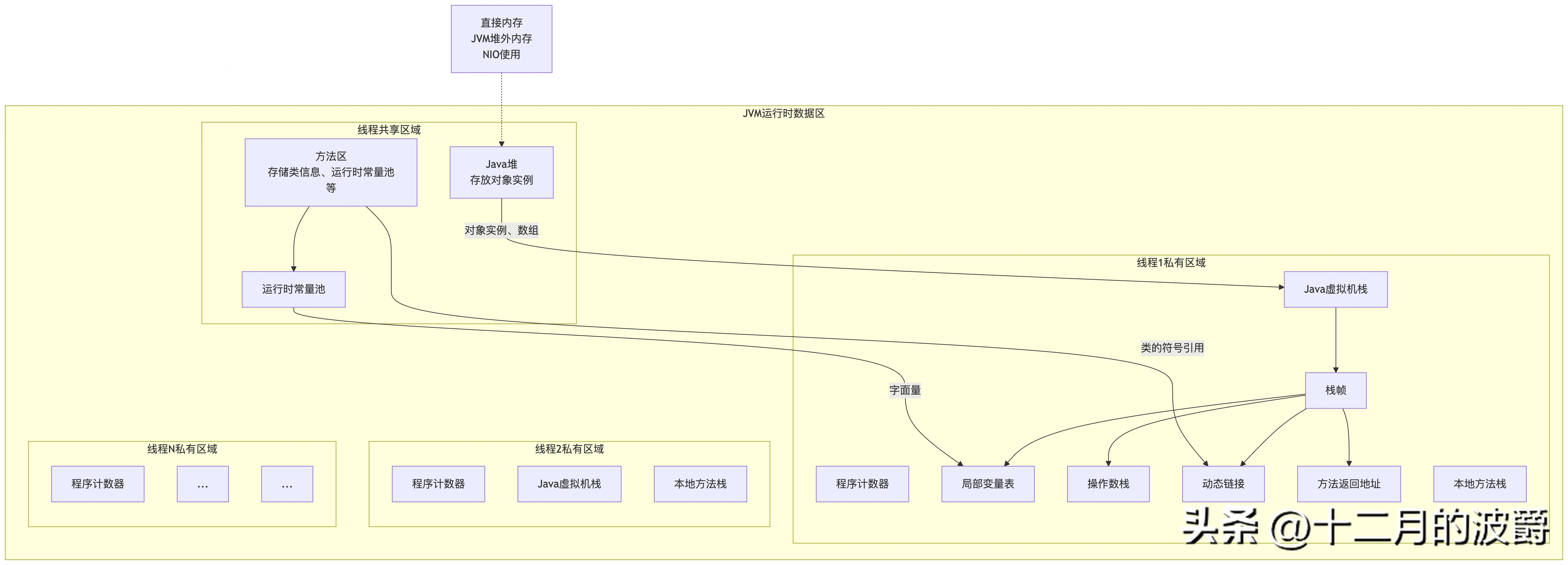 下图清晰地展示了JVM运行时数据区的核心组成部分及其关系: