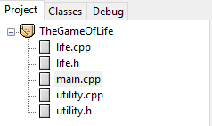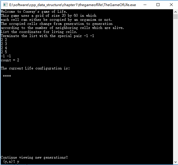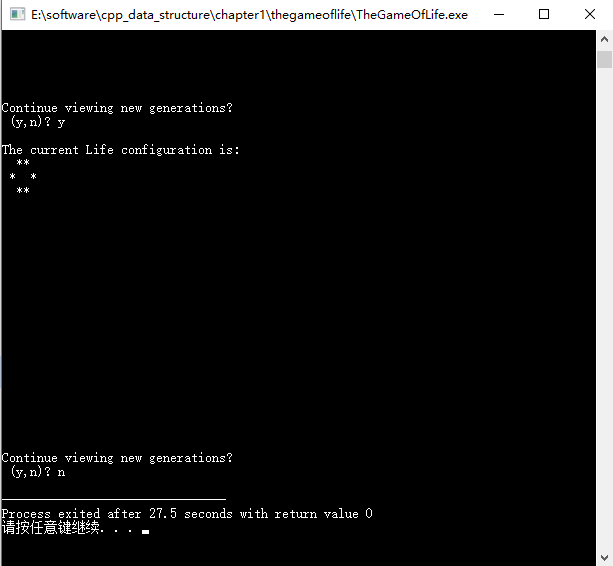 此外,我们还需要编写两个辅助函数:instructions()用于打印使用生命游戏的说明信息;user_says_yes()用于获取用户的输入,并判断是否为肯定回答。这两个函数分别在utility.h中声明并在utility.cpp中实现。