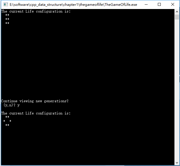 运行生命游戏程序后,我们可以看到一个由星号(*)表示的生命单元组成的初始布局。随着每个世代的更新,生命的数量和分布会发生变化,根据生命游戏的规则(B3/S23),只有在有2个或3个邻居时生命才能存活。通过观察这些动态变化,我们可以感受到生命游戏中的简单规则如何产生复杂且意想不到的行为模式。