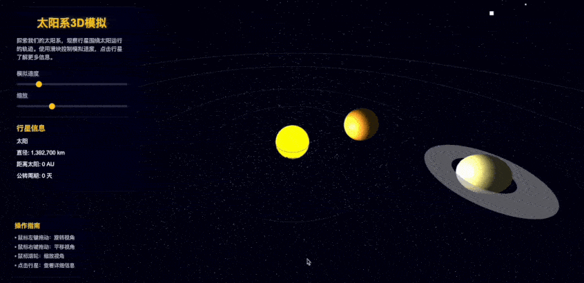 Case展示: 输入指令“模拟太阳系,8大行星围绕太阳旋转,镜头拉近地球”。