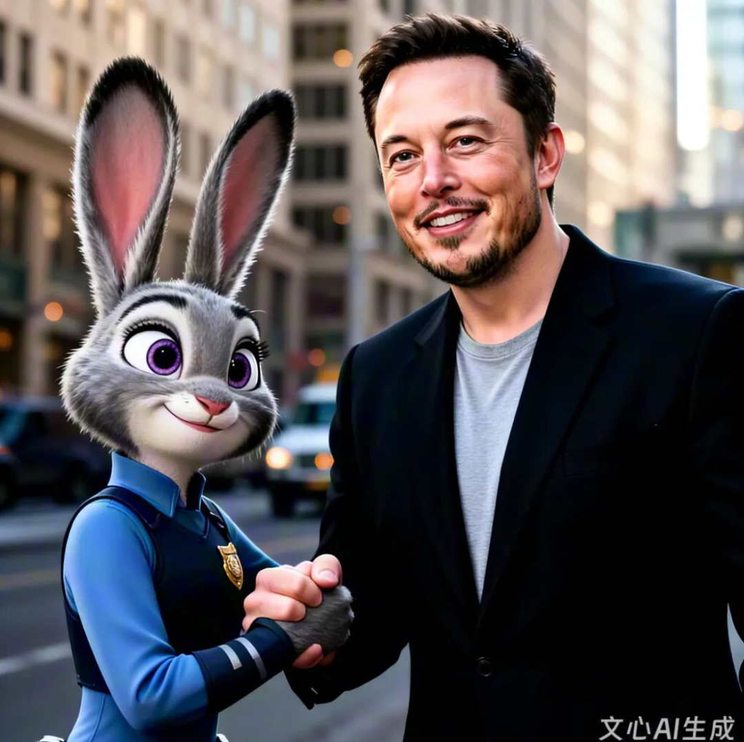 Case展示: 一张马斯克与《疯狂动物城》朱迪警官握手的图片。