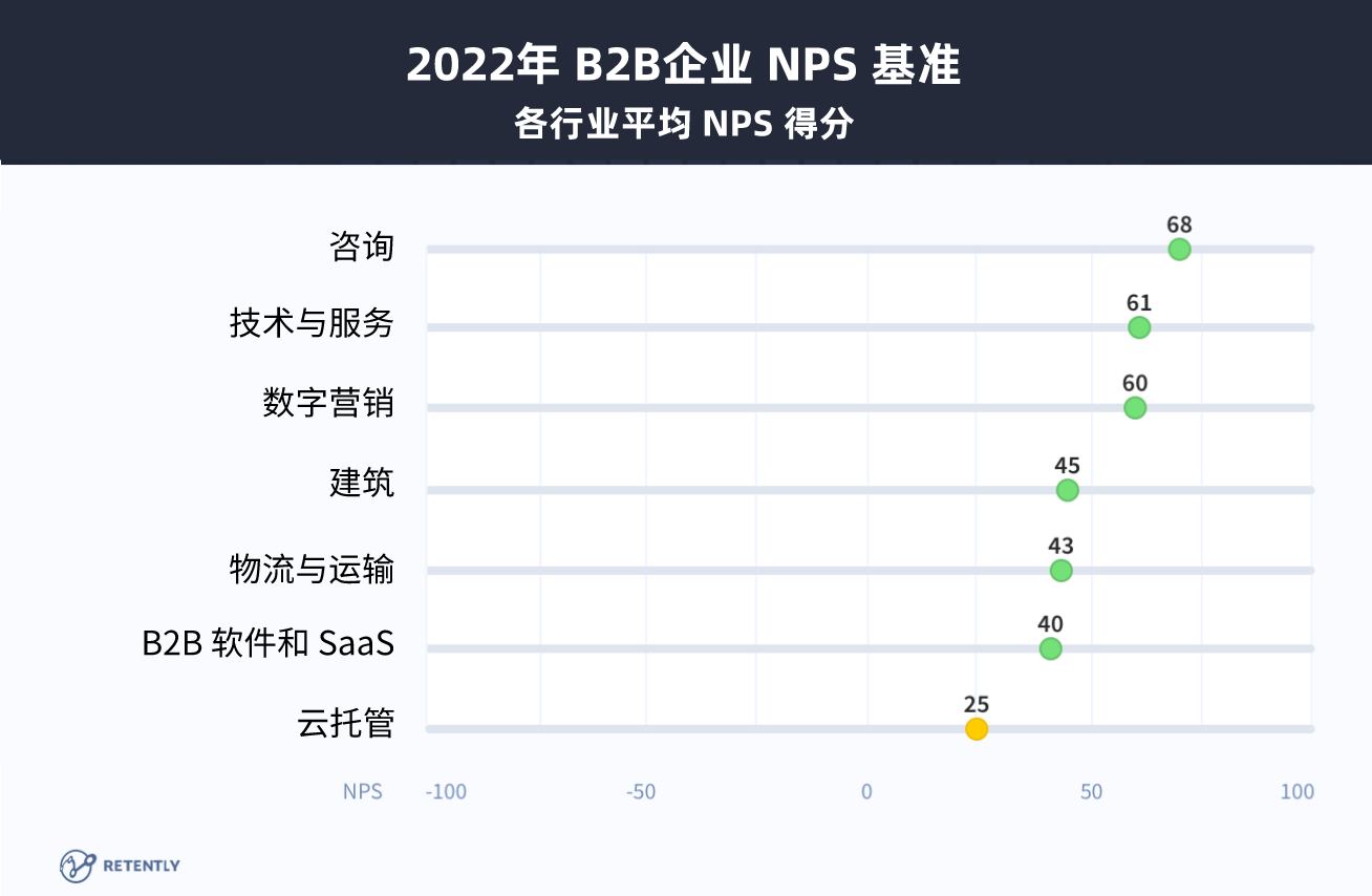 在 Retently 2022年 NPS 基准报告中,展示了 B2B、B2C 多个行业的 NPS 基准值。令人震惊的是,所有行业的得分都在 0 分以上,平均分值在 4 到 71 之间。