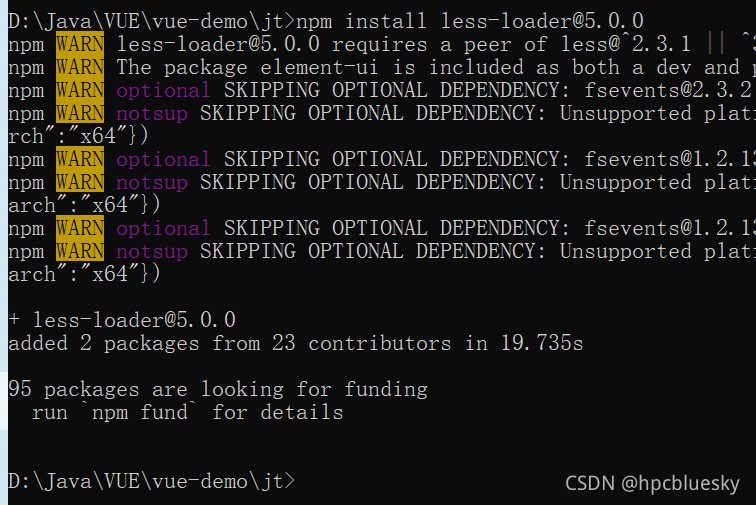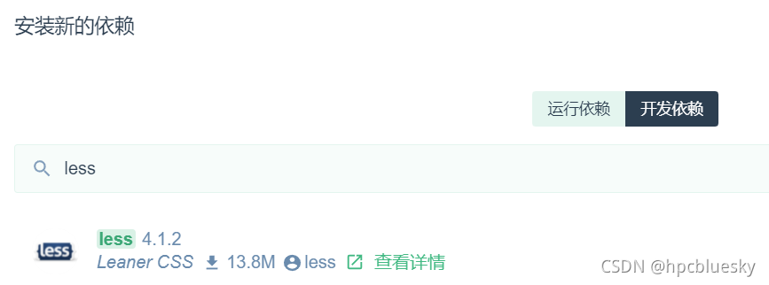 16、安装开发依赖less-loader,版本不宜太高,项目根目录:npm install less-loader@5.0.0