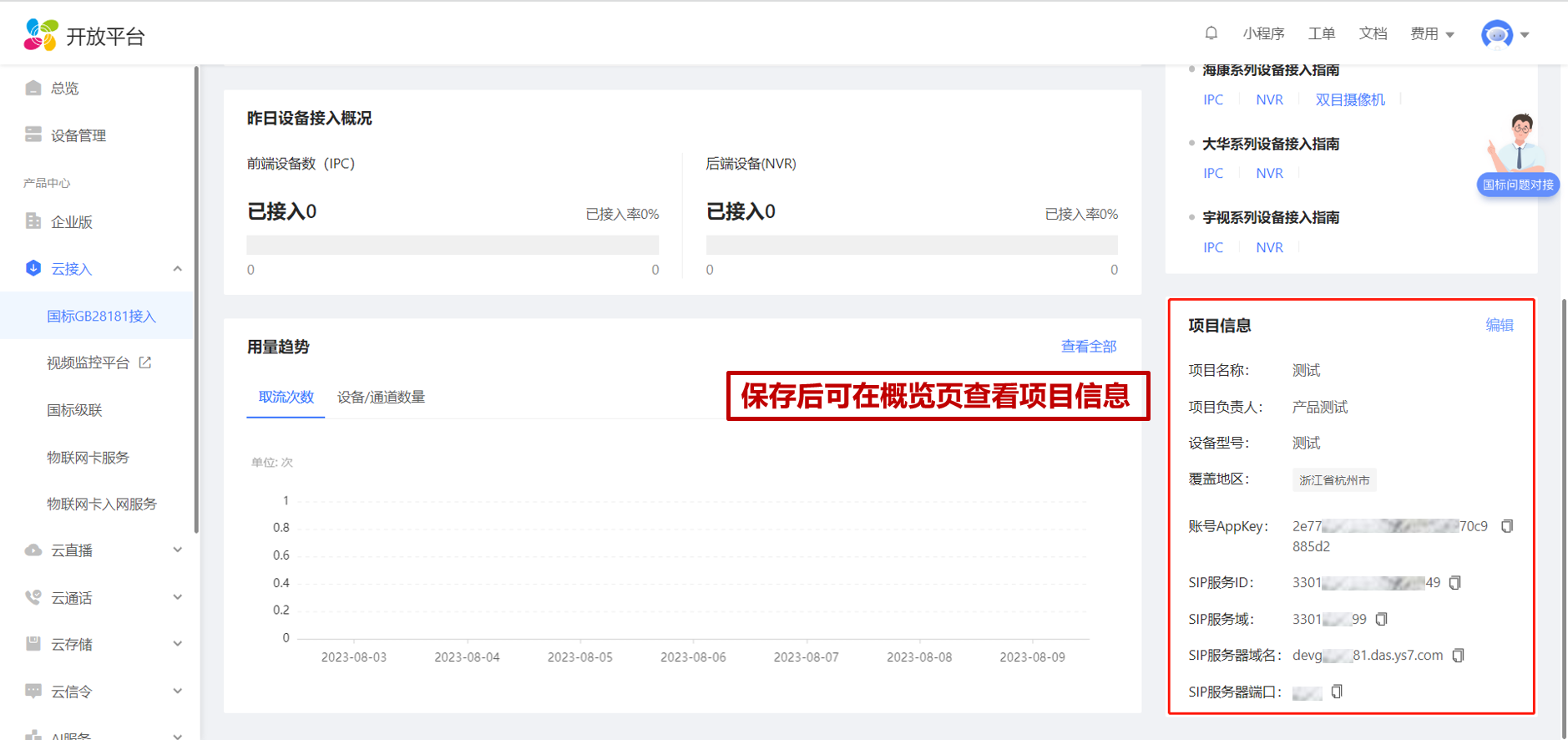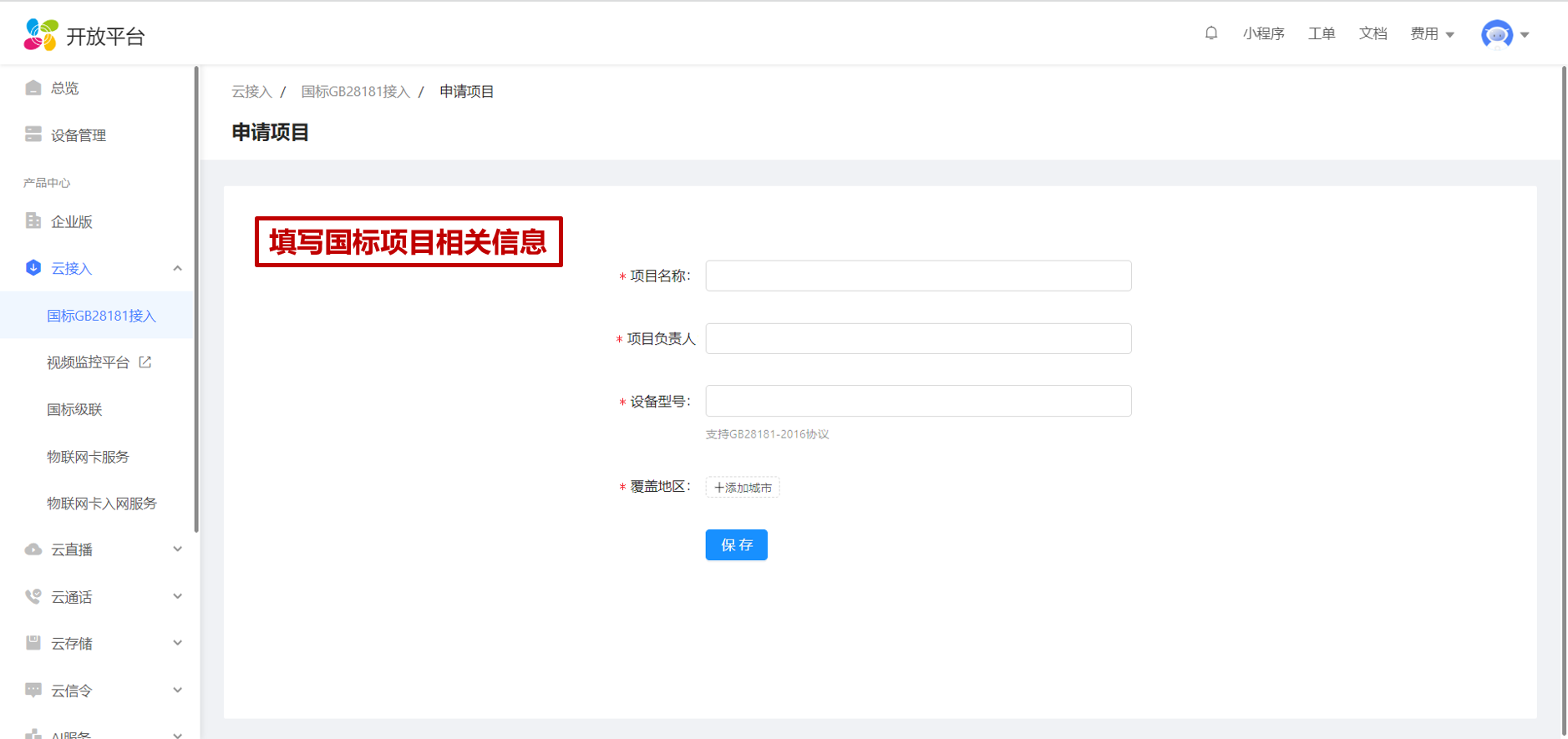 首次进入国标控制台,须先提交项目信息,开通国标服务。