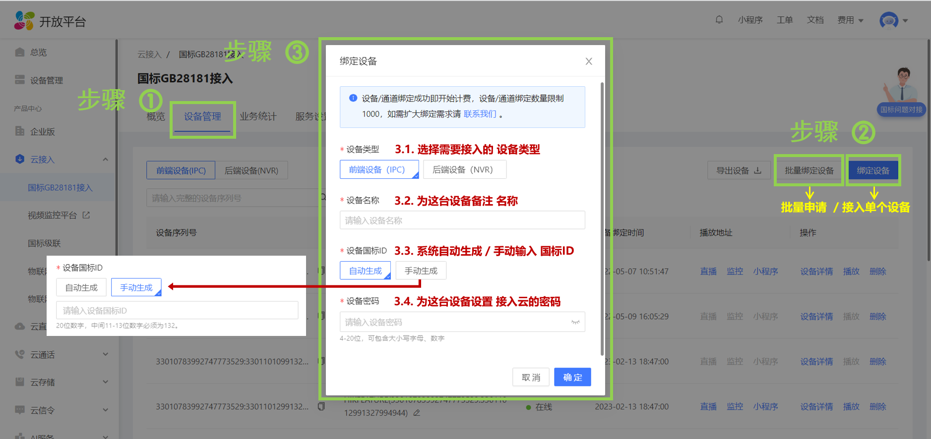 进入国标控制台 “设备列表”,点击“绑定设备”/“批量申请”按钮,支持 单独申请/批量申请 设备接入开放平台所需要的配置参数(其中,“单独申请模式”已支持用户手动编辑“设备国标ID”)