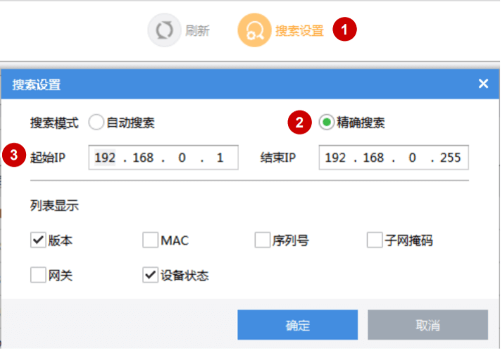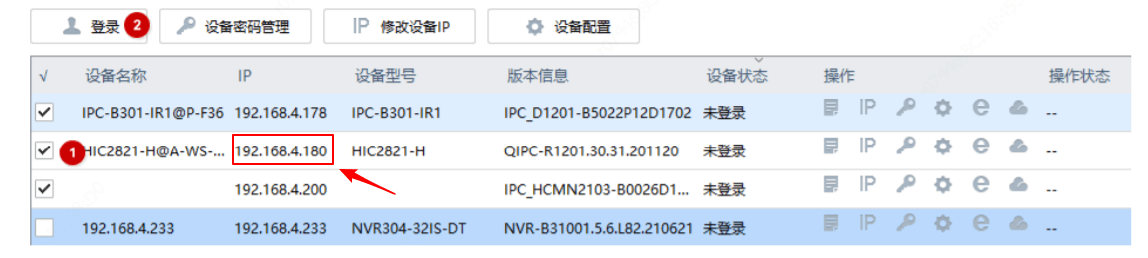 b) 如果说明书遗失、默认IP地址不能用或者修改过,则需要使用宇视的EZTools(PC端)工具按照下图步骤搜索局域网设备(图1),搜索到设备后,按照步骤勾选需要配置的设备,点击登录,并在列表的IP字段中,获取到设备的IP地址(图2)。