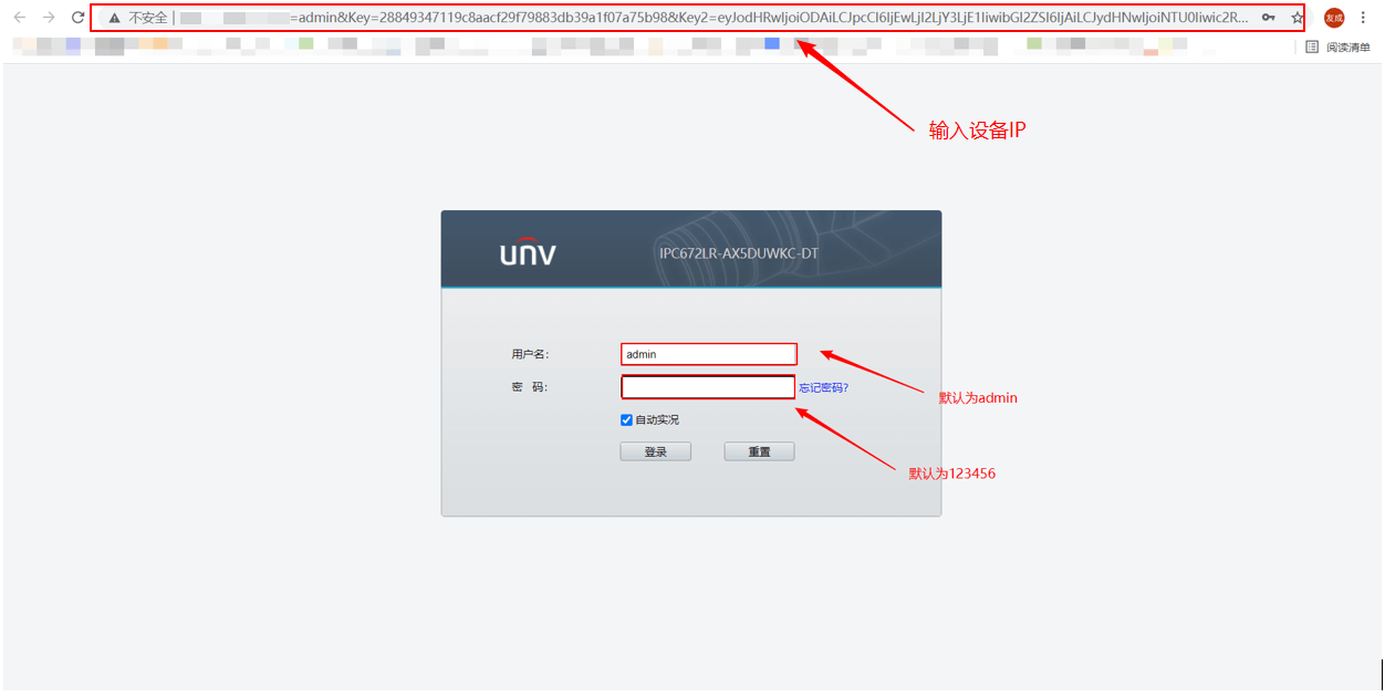 1. 在浏览器(IE9及以上)地址栏中输入设备IP地址,按Enter键,进入设备web客户端界面。(账号和密码默认为admin和123456,如果更改过则填入更改过的账号和密码)
