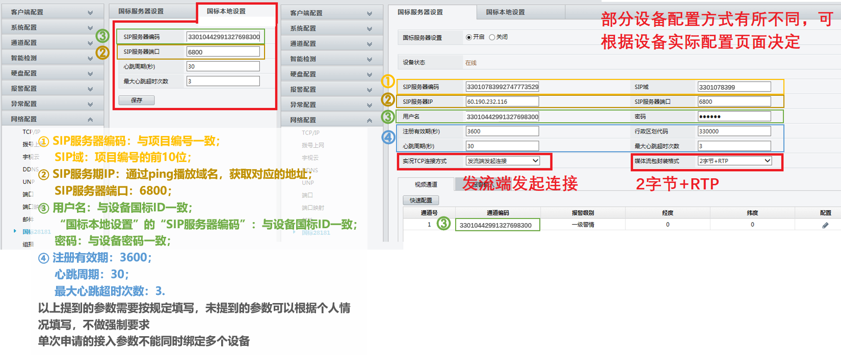 · 若设备上线失败且设备所连网络有防火墙相关设置,可以将开放平台的ip端口添加到白名单中,放开网络对开放平台的限制(电信:60.190.232.116;联通:124.160.120.116 移动:112.13.217.116;域名: devgb28181.das.ys7.com;端口:6800)。