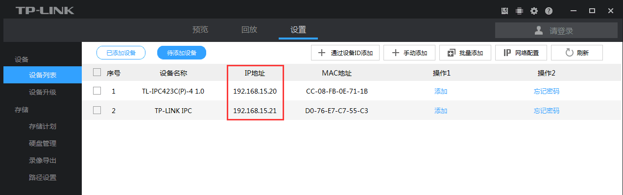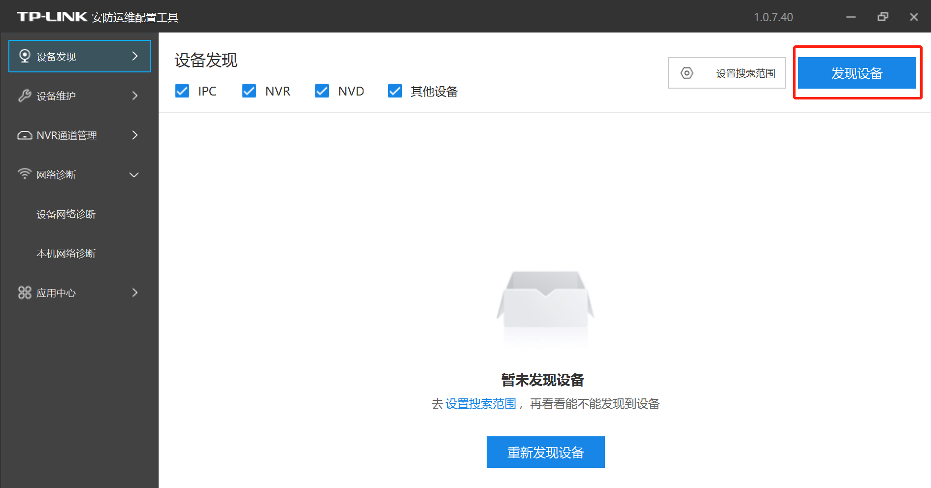 将设备与PC接在同一个局域网内,使用 TP-LINK安防运维配置工具搜索局域网设备,获取设备ip 。