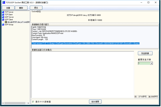 - 使用SocketTool工具模拟设备,向服务端发送SIP注册报文,看是否能收到服务端主动发出的设备信息查询请求。