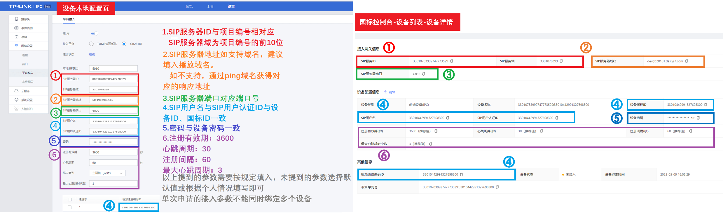 请核对各项参数填写的正确性,确保每一组接入参数都只对应一台设备使用。特别注意“注册有效期”为3600,“心跳周期”为30。