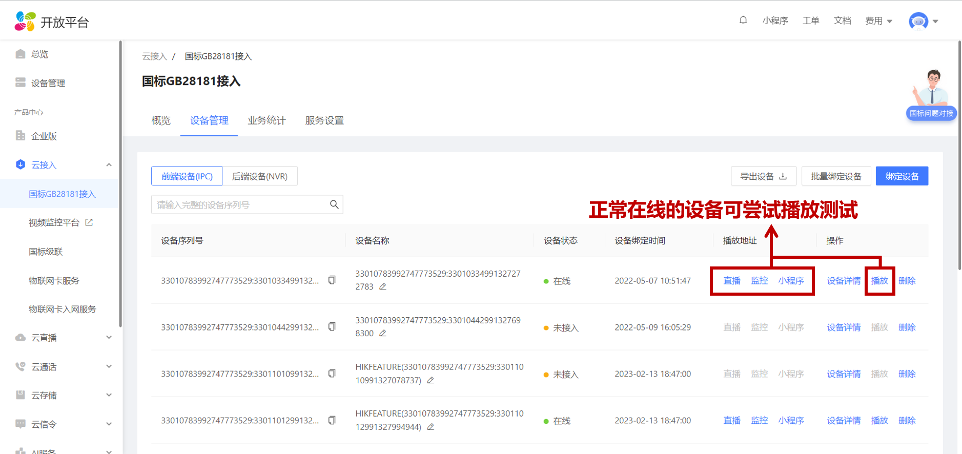 1.您可在“国标控制台-设备列表”页面,核对“设备状态”是否为在线(一般完成配置后,在线状态更新为8s-60s。),并点击“播放”等按钮测试设备是否能否正常播放。若设备不在线/没有可用播放地址/播放失败,请优先参照接入文档“常见问题”,核查接入参数是否遗漏或配置错误。