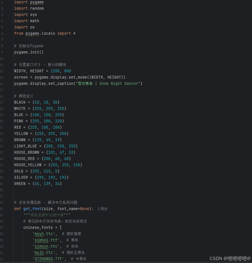 我使用Pygame库来创建一个动画,展示一个下雪的夜晚,一个女孩在雪中跳舞。