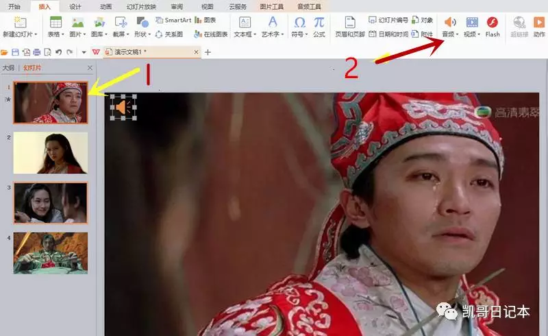 2.点击插入,再点击第一张图片,会看到上部菜单栏音乐标签亮起,点击音乐,把准备好的背景音乐添加至PPT。