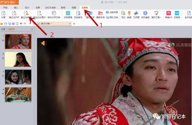 5.完成上面操作之后,基本就完成了,下面就是把幻灯片以视频格式导出。如图,点击右上角的云服务,再点击输出为视频即可。