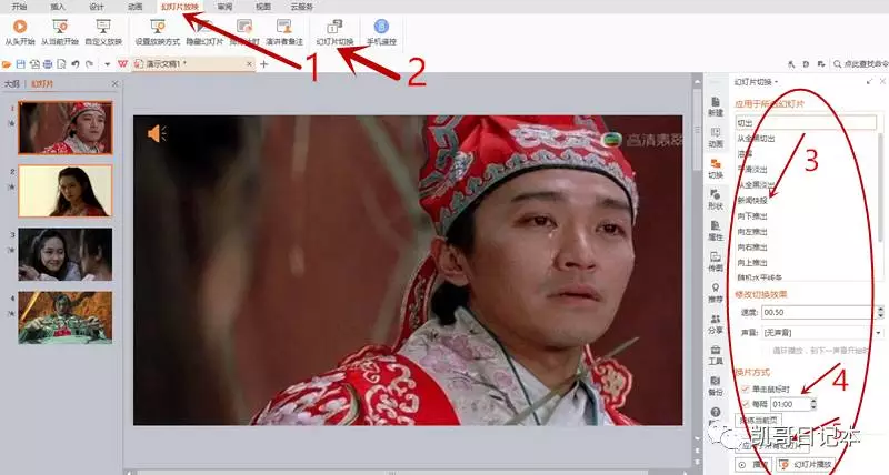 4.点击头部菜单栏幻灯片放映,然后再点击幻灯片切换,界面右边就出现了幻灯片切换一系列操作按钮,这里也可以一个个的给图片设置动画和切换效果,根据音乐时长和幻灯片的张数设置时间,和切换效果。