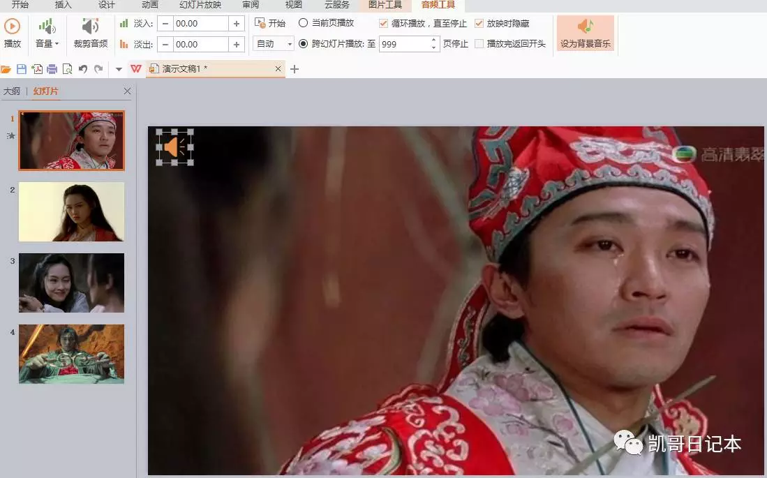 3.然后再点击一下幻灯片中的音乐的图标,可以将音乐设置为背景音乐。