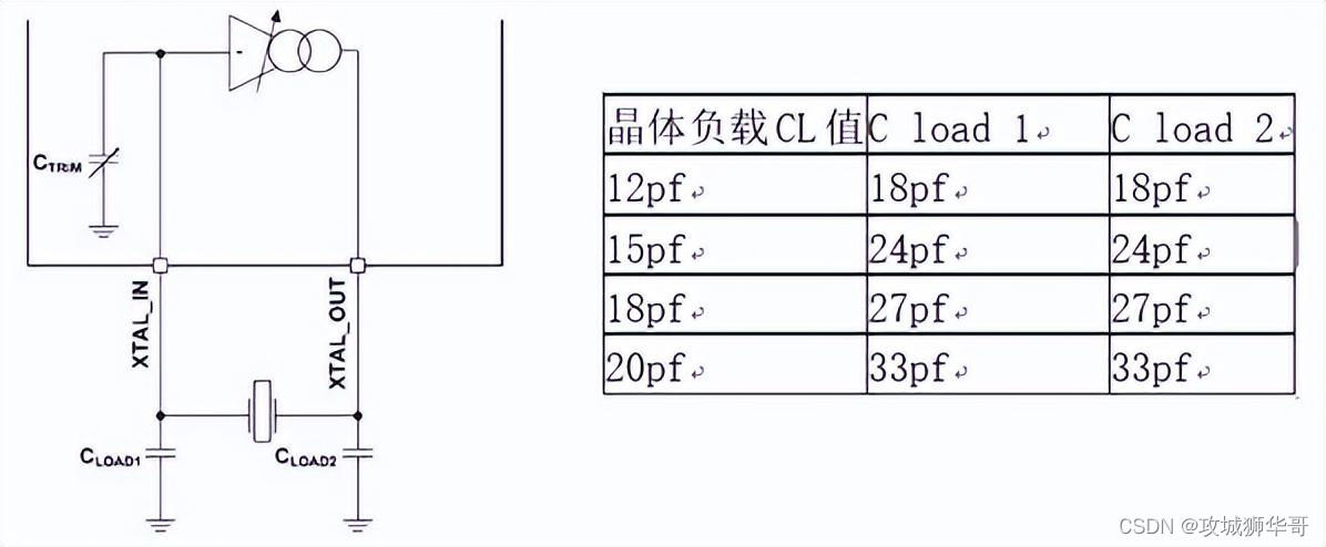 从下图可以看出来两个电容是并联关系,晶体的负载电容值的确定除了要考虑两颗电容并联后的结果以外,还要考虑板上的寄生电容的影响,根据经验会按照3-5pF进行补偿计算,实际还是要以测试实际测量输出频率的偏差来进一步调整负载电容的大小,两个负载电容的大小不要求值完全一样。