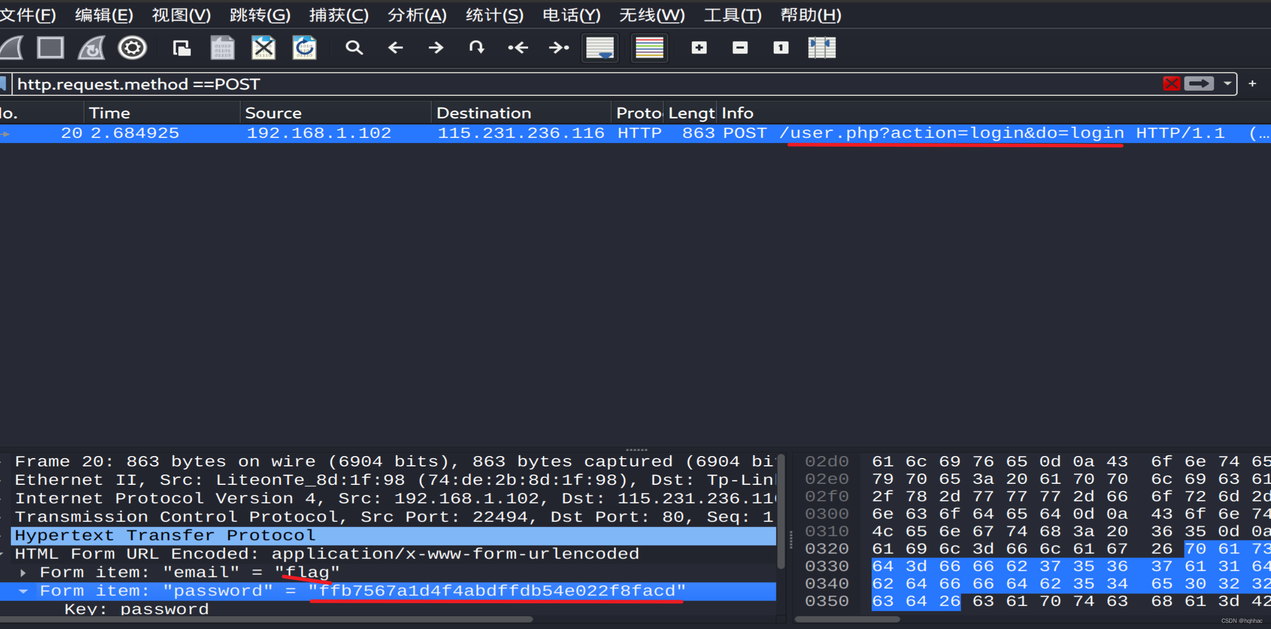 通过筛选语句 http.request.method ==POST 筛选出流量包,分析可知该题目的flag是登录user.php?action=login&do=login时的密码