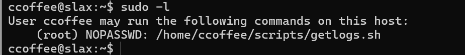 在执行 sudo –l 时,我们观察到在执行命令 /home/ccoffee/scripts/getlogs.sh 时没有为此用户设置密码