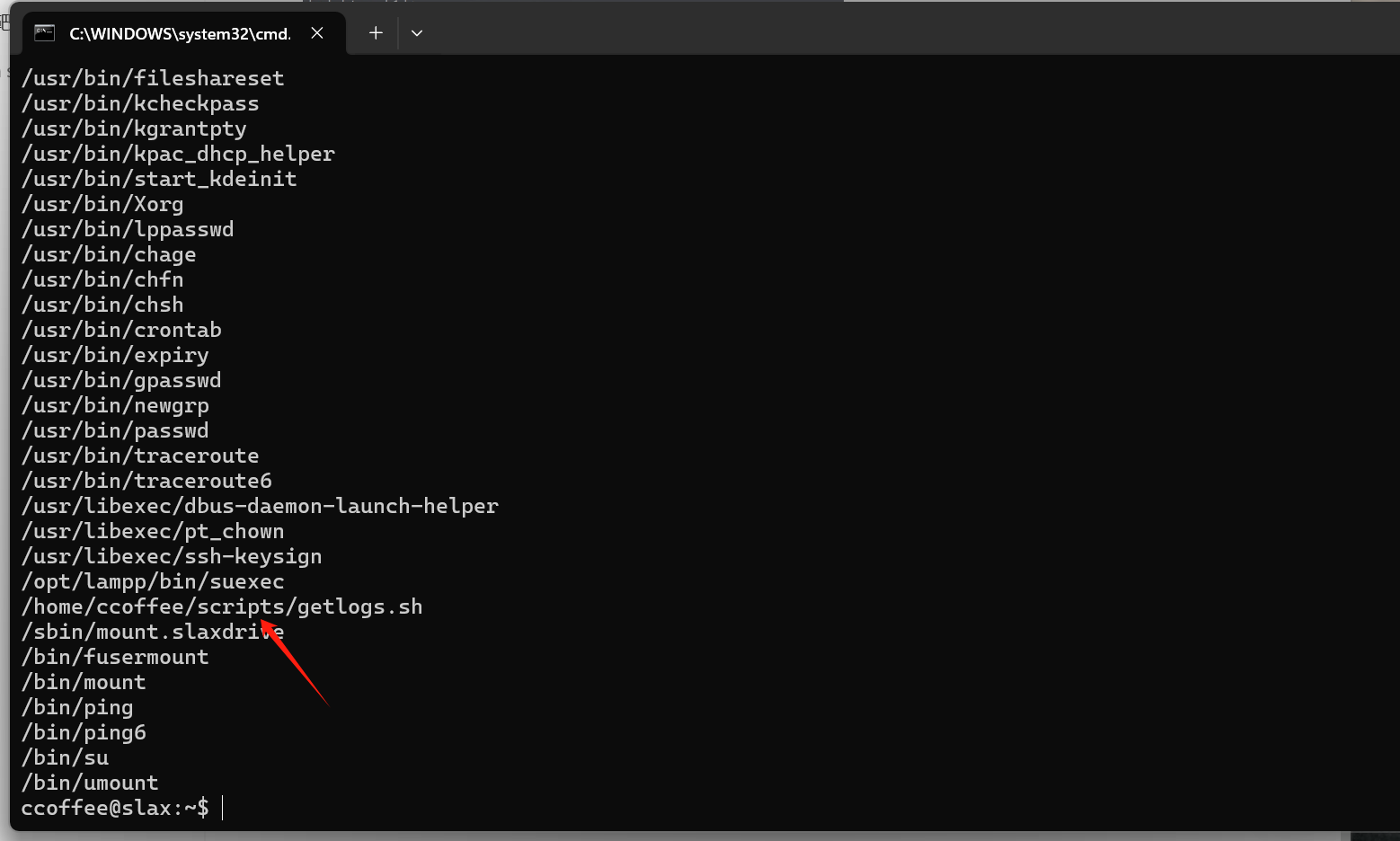 从截图中可以看出,在列出的所有用户中,用户 ccoffee 为位于路径 /home/ccoffee/scripts/getlogs.sh 命令启用了 SUID 位,这意味着我们可以执行 getlogs.sh 命令内的任何命令