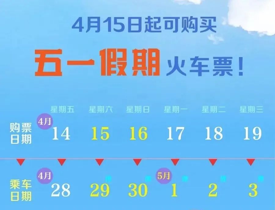 4月15日五一假期首日火车票开售,也就是可购买4月29日的火车票,5月3日的回程火车票将于4月19日开售。