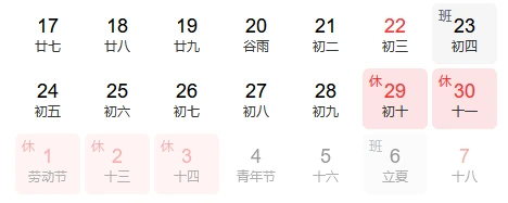 2023年4月29日(星期六)至5月3日(星期三)放假调休,共5天。4月23日(星期日)、5月6日(星期六)上班。