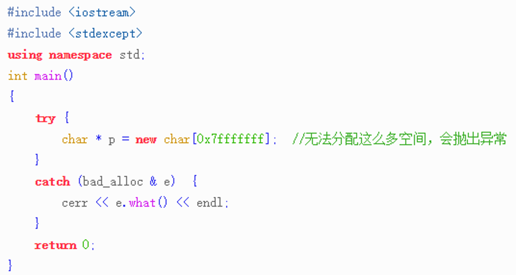 - 用 new 运算符动态分配空间时,空间不够导致无法分配;