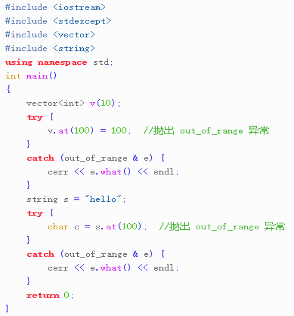 用 vector 或 string 的 at 成员函数根据下标访问元素时,如果下标越界,则会拋出此异常。