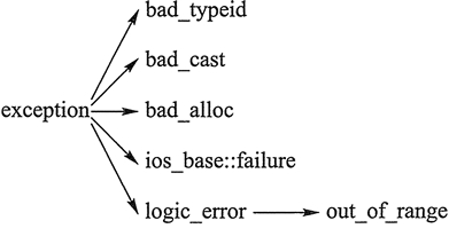 C++ 标准库中有一些类代表异常,这些类都是从 exception 类派生而来的。常用的几个异常类如图 所示。