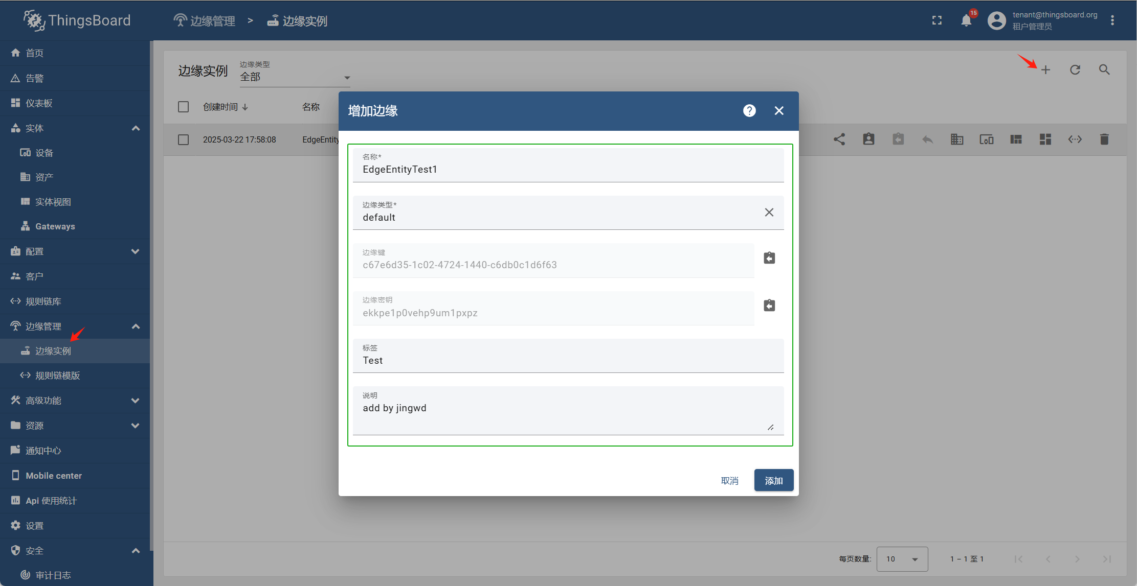 左侧导航菜单“边缘管理”,点击右上角“+”按钮,开始增加边缘实例,如下: