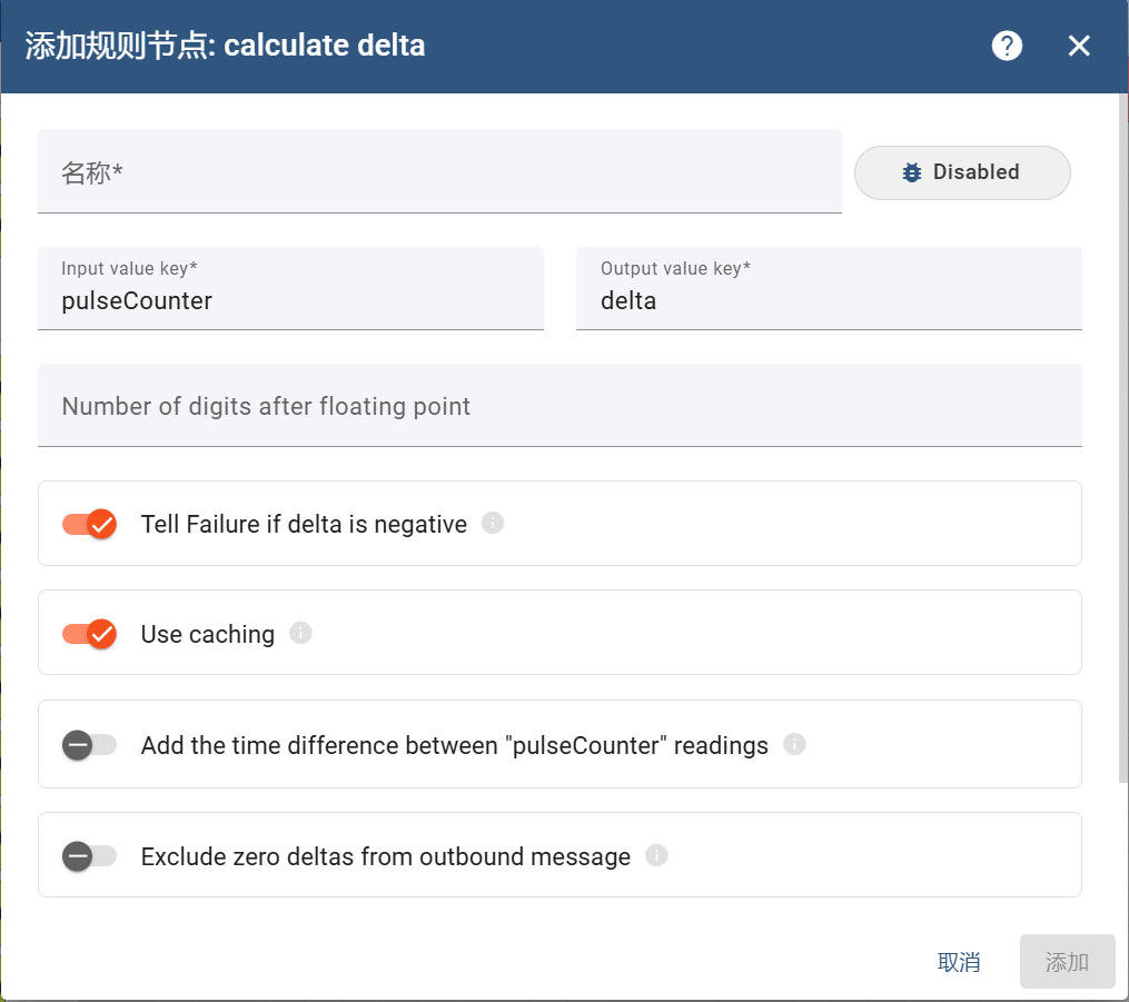 本节点:用来计算当前传入消息中的当前时间序列键值与上一次读取值之间的数值差值(delta)、时间间隔(periodinMs)。