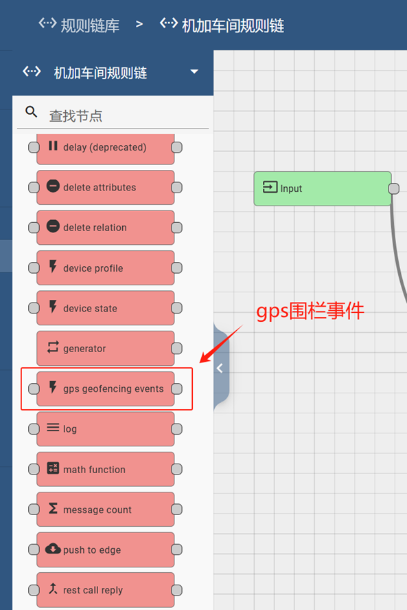 最近在整理课程,基于最新ThingsBoard版本3.9.1/4.0,欢迎大家点赞,收藏、关注我,提问,在评论区留言,我争取把最新、最准、最好的课程,呈现在各位亦师亦友的csdn广大读者面前。 目录 规则节点gps geofencing events 本节点说明 配置说明 使用方法 应用场景测试 测试结果 规则节点gps geofencing events 本节点说明 根据设备的经纬度位置数据,判断设备是否进入或离开某个围栏区域,并触发相应的事件。 在规则链中新增一个gps geofencing events,如下: