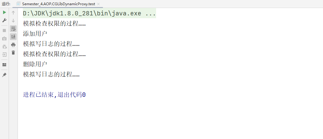 主要的就是使用Enhancer类去获取动态代理对象,并且通过intercept()方法去处理增强方法与原始方法的关系,完成配置之后,我们就可以来到测试类进行测试了: