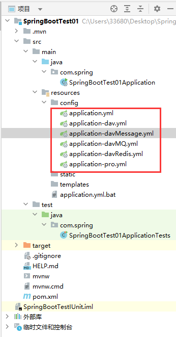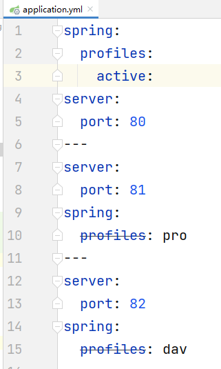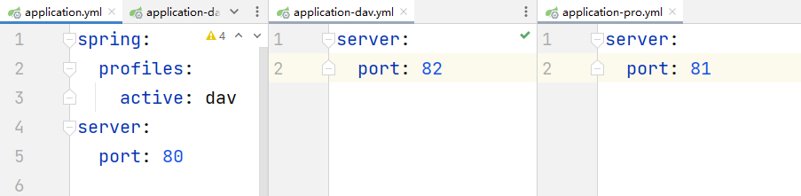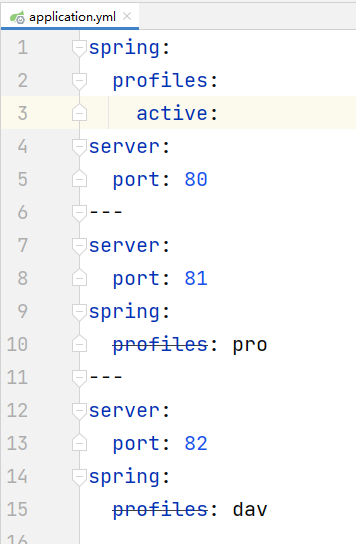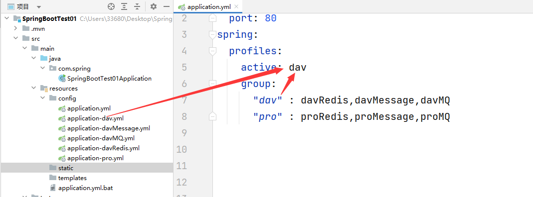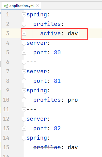 注意我这里的文件名:application-xxx.yml,这里需要着重说一下文件名,因为我们在配置文件中并没有标注环境的唯一标识,那么文件的后缀,也就是xxx的部分就是我们环境的唯一标识,当我们想要启动这个配置文件的时候,使用它来定位唯一的环境变量,比如我们要启动application-dav.xml这套环境,那么我们就需要将spring.profiles.active的值修改成dav: