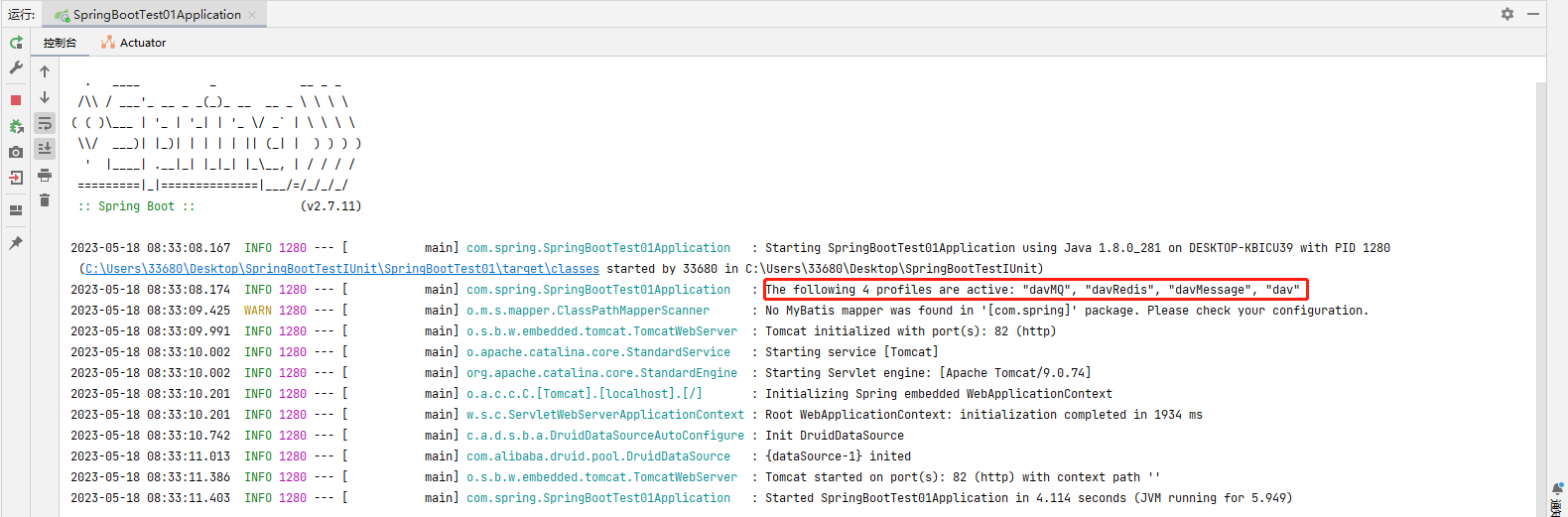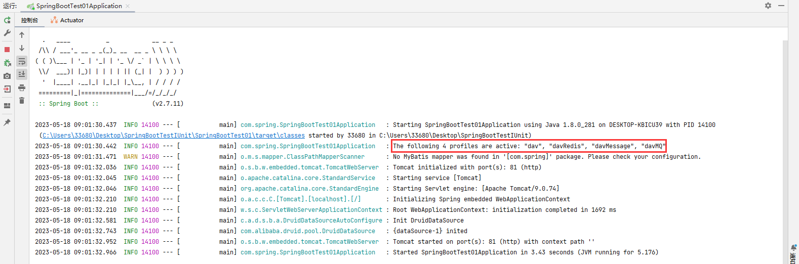 可以看到,确实是从我们在application-dav.yml中配置的端口启动了服务,并且上面也出现了使用dav环境的标识,现在我们再来换一下,启动 pro环境: