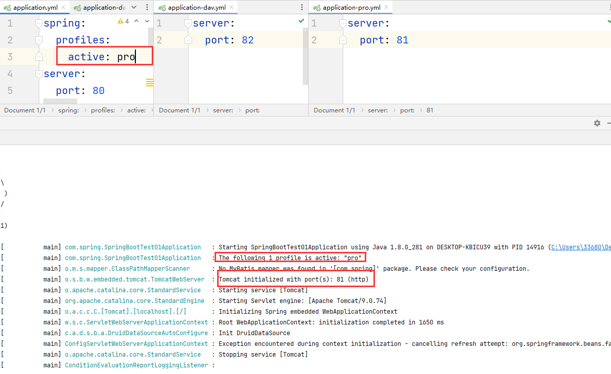 这时候就变了, 变成我们在application-pro.yml中配置的端口启动了,那么就说明我们的配置是正确的。