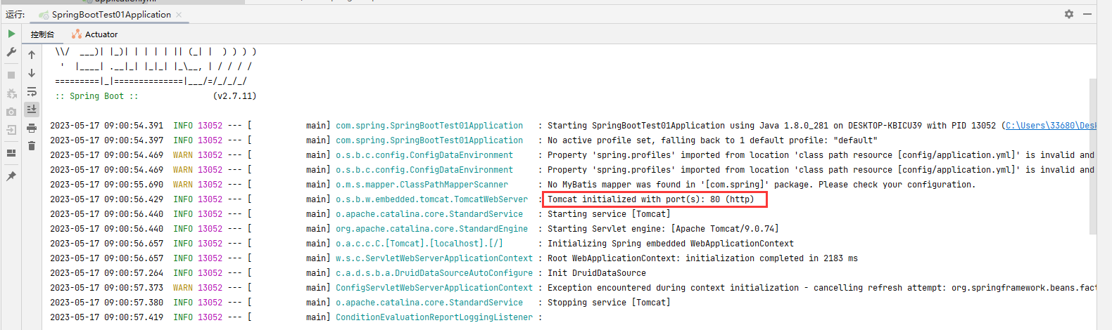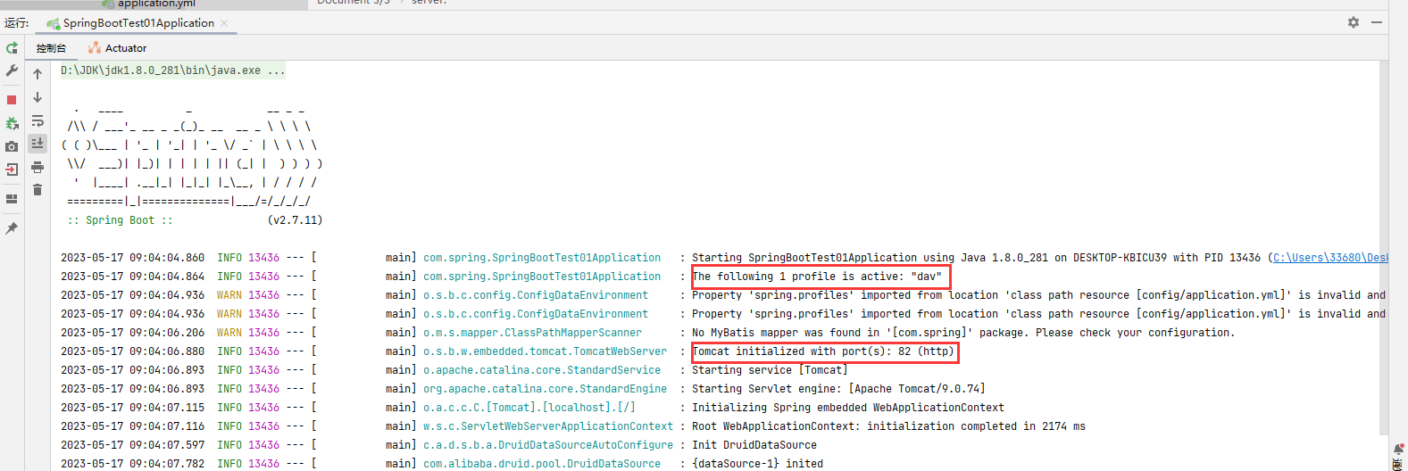 可以看到,我们的服务器确实在80端口启动了,然后我们切换环境到dav环境,切换环境的方法就是将spring.profiles.active的值修改成对应环境的唯一标识即可: