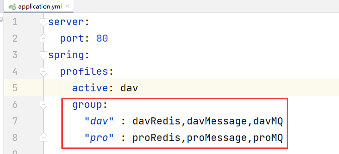 那么在使用这种形式的时候,我们要注意,要保证你主环境配置文件的唯一标识,也就是application-dav.xml中的dav,与我们的分组中的分组名dav要保持一致,并且active的值也要是dav才能顺利的加载所有的配置文件: