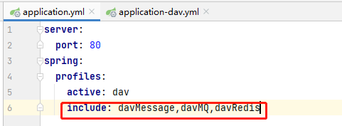 我们在默认的配置文件中将我们之前写的多个分散的配置文件,通过include属性的方式引入进来,首先配置文件要放在同一个目录下,在写的时候,完整的文件名是application-davRedis.yml,我们可以简化成去掉application-,和后缀,也就是只写davRedis的形式。