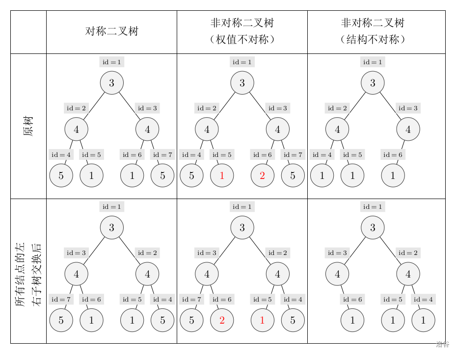 - 将这棵树所有节点的左右子树交换,新树和原树对应位置的结构相同且点权相等。
