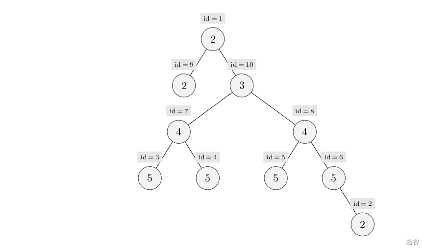 下图中节点内的数字为权值,节点外的 ididid 表示节点编号。