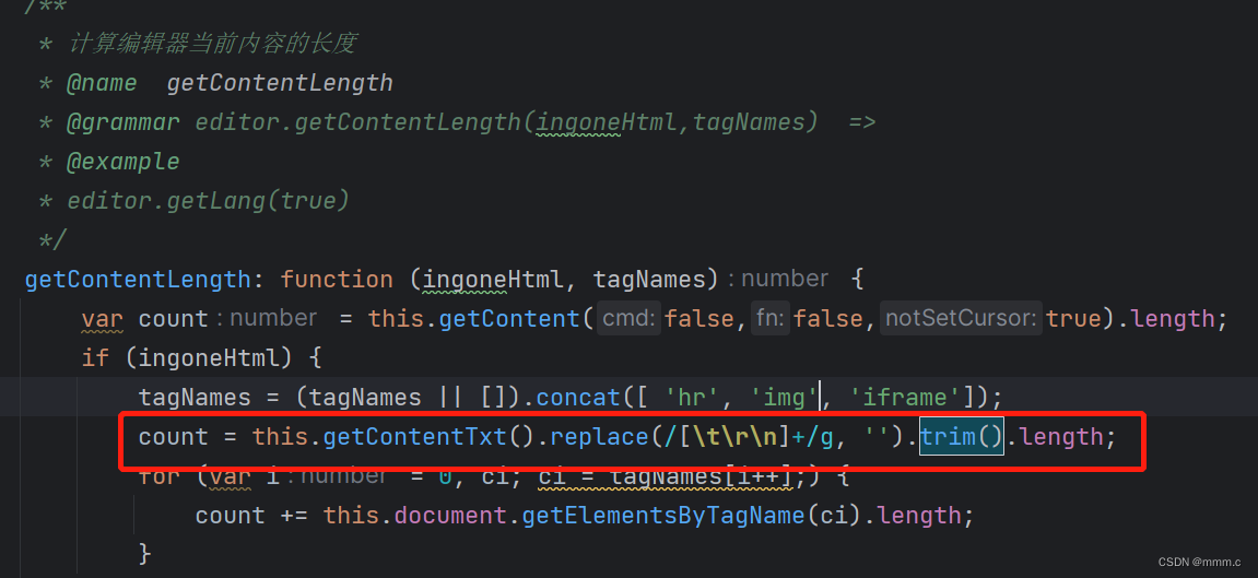 这里我面对的需求是统计除去空格的输入字数,所以这时的修改是不够的,还需要进一步添加校验,也很简单,在获取内容长度getContentLength: function (ingoneHtml, tagNames)这个方法中修改: