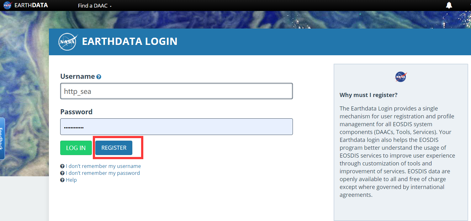 - 点击上图中红框中Earthdata Login进行注册或点击https://urs.earthdata.nasa.gov/进行注册,记好用户名和密码。准备好个人邮箱,其中有个选项需要选择国家,个人建议不要选中国,道理你懂的