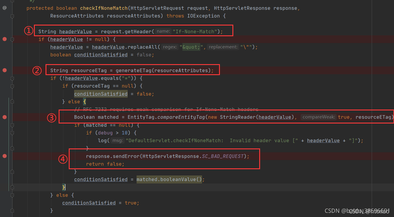 最近又有空余时间了,去看了些tomcat源码文章(大量重复文章,讲重点的内容时又一笔带过),还是没有思路,于是又用比较工具查看,这次时间较多,耐心的一个文件一个文件的查看变动的位置,终于在changelog文件里看到400字样,当时那个心情呀,一则因为终于找到问题所在了,一则因为自己不清楚源码中有changelog这个文件,还有对源码的不熟悉。后来为了查找这次修改改动了哪些文件,又去git上拉源码,查找变更日志,将此次变更的几个文件逐一查看,终于在DefaultServlet的变更中看到了HttpServletResponse.SC_BAD_REQUEST常量,点进去一看,果然对应的数值就是400了,其实前面使用对比工具比较差异时,也看到了这个类和这个常量,只是没有细心考虑。于是将断点都设置在这个方法中了,确认是进到此方法,在下图图中第④处返回了错误信息,当时也是不清楚为啥走到这里了,然后继续查找相关文章,使用DefaultServlet、checkIfNoneMatch、"If-None-Match"查到了些相关文章,但都是以前版本的tomcat,对此还是无解,后面又无意间找到文章提到了304,指出页面的静态资源再次请求时会将"If-None-Match"对应的值与此类中再次生成的值进行比较,相同则返回304,浏览器使用自身缓存的静态资源。再次debug并进比较方法中,发现浏览器界面传过来的的引号被转义成accssi码了,比较方法中未作任何转换直接进行比较,导致将引号"与&进行比较,导致第③处返回null,进入图中第④处后返回400给浏览器了,图片就加载失败了。