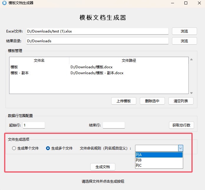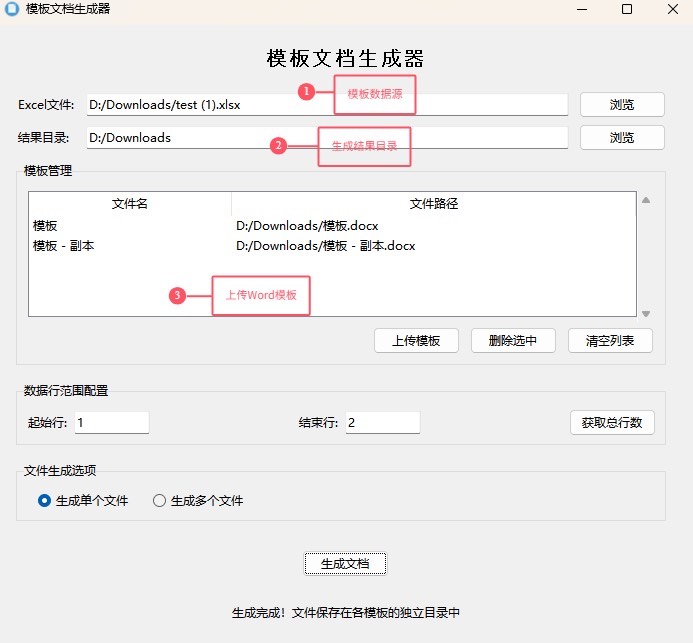 基于Excel中的数据行,软件可自动批量生成多个独立的Word文件,如劳动合同、邀请函、投标书等,真正实现“一键生成”,节省大量重复操作时间。