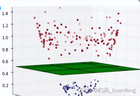 那么这个时候支持向量机软硬不吃,此时要想解决这个问题,我们可以使用一种魔法,我们将他们映射到一个高维空间中,然后再高维空间中进行分割,那么就会出现这种情况: